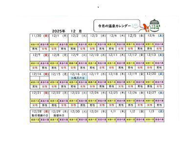 12月温泉入浴カレンダー&第3火曜日はお風呂の日